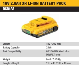 - Genuine DEWALT 18V 2.0Ah XR Li-Ion Battery Pack (Model: DCB183-B1)