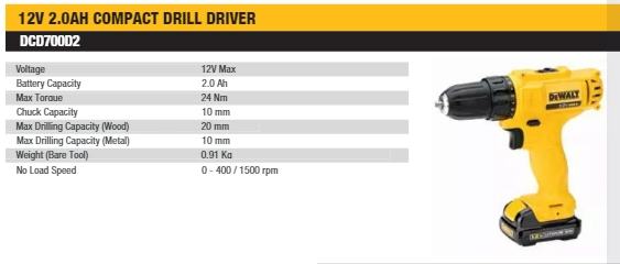 - Model: DEWALT DCD700D2 12V Compact Drill Driver Kit