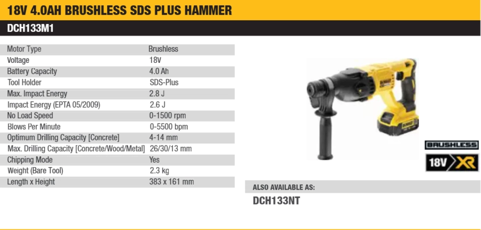 The DeWalt DCH133NT-XJ 18V Rotary Hammer Drill delivers reliable performance with its brushless motor, ensuring longer runtime and reduced maintenance. Designed for professional drilling in concrete, masonry, and metal, it offers three modes—hammer drilling, drilling only, and chisel—for versatile use on-site or at home.