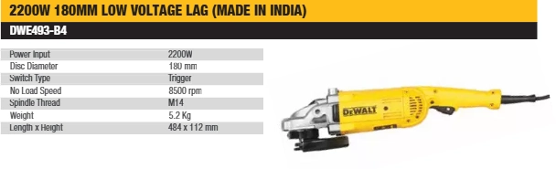 The DWE493-B4 is a powerful 2200W angle grinder designed for professional and industrial applications. Equipped with a 180 mm disc, it delivers high performance for heavy-duty metal cutting, grinding, and masonry work. Its low-voltage LAG motor ensures consistent power, even under demanding conditions, making it a reliable choice for workshops, construction sites, and fabrication tasks.