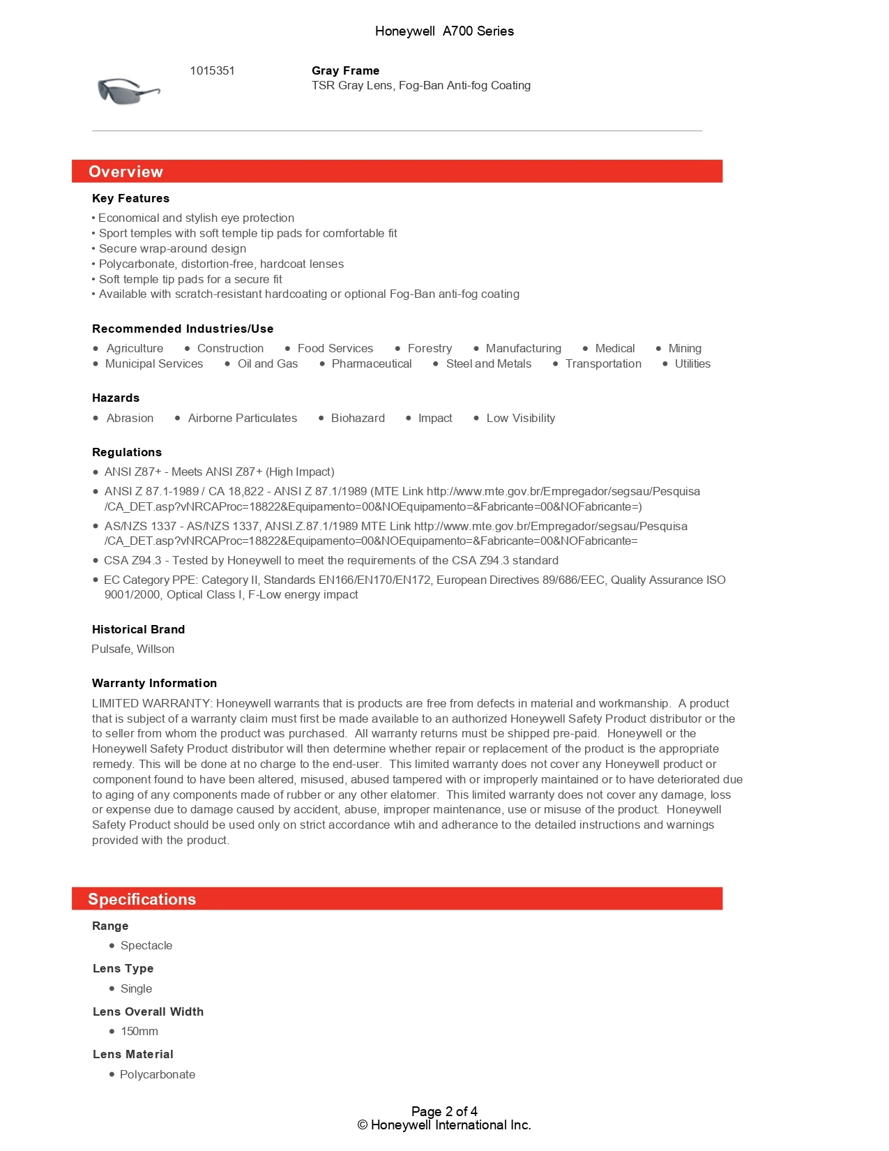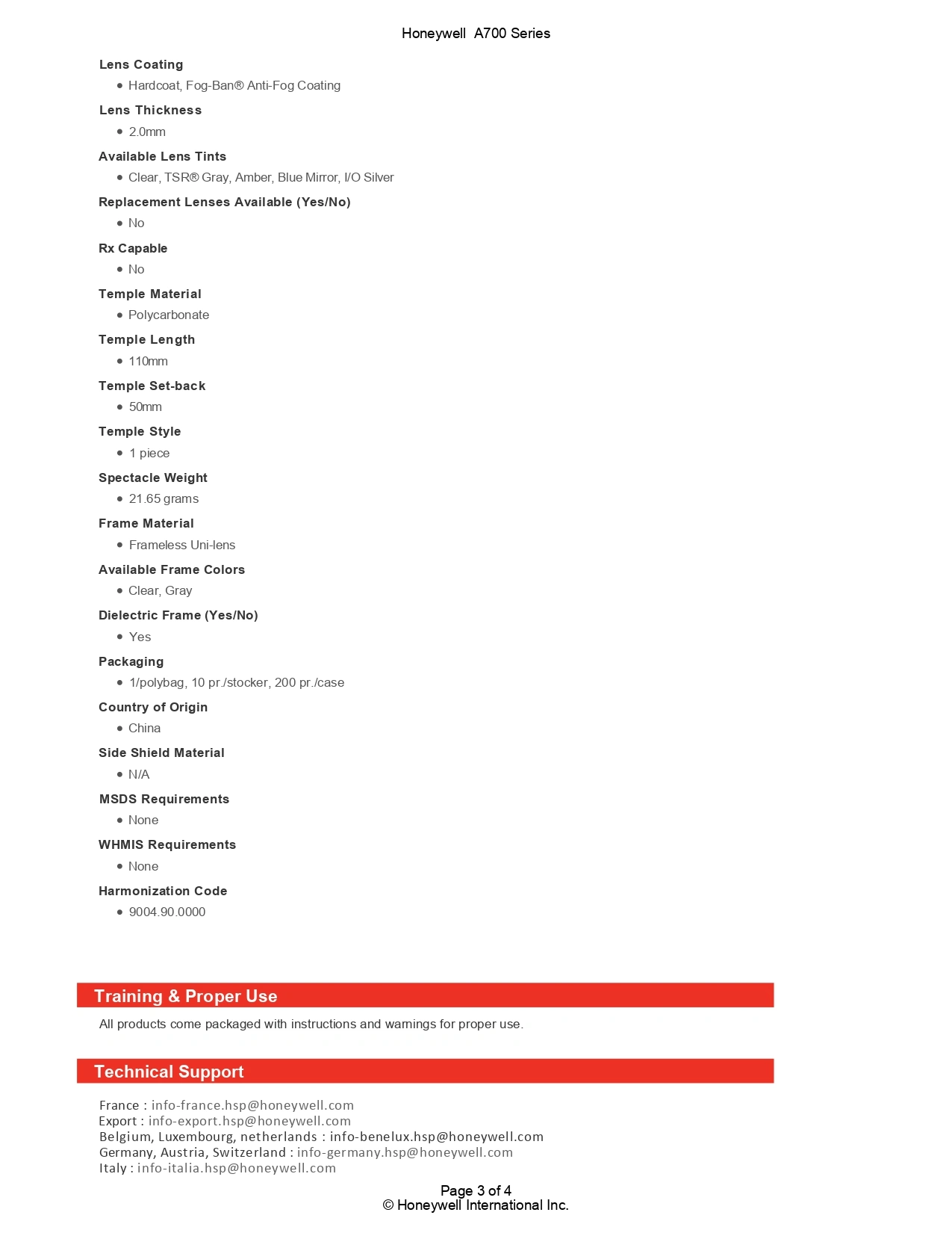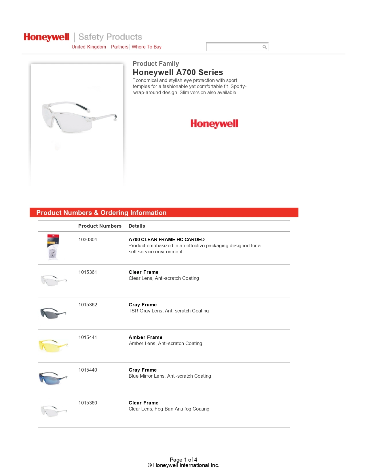 Features of Honeywell A700 Safety Glasses