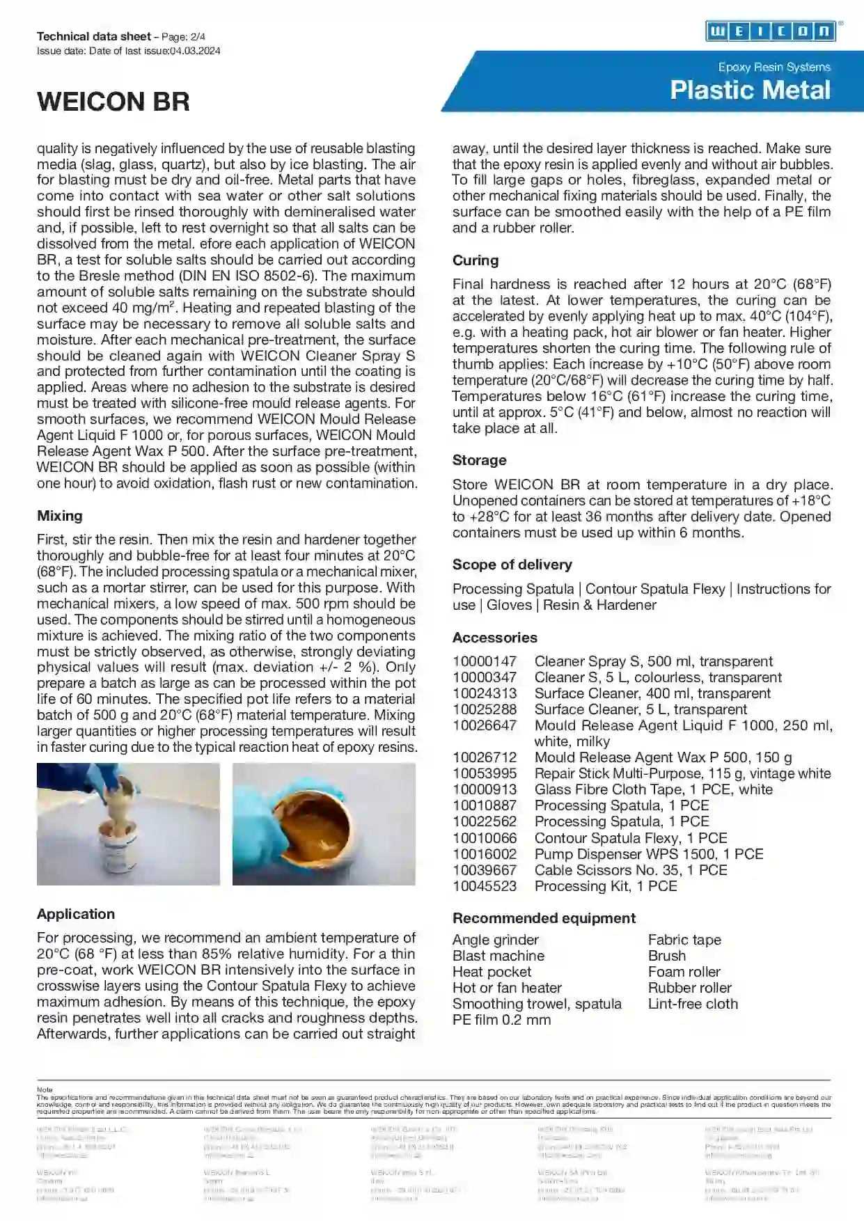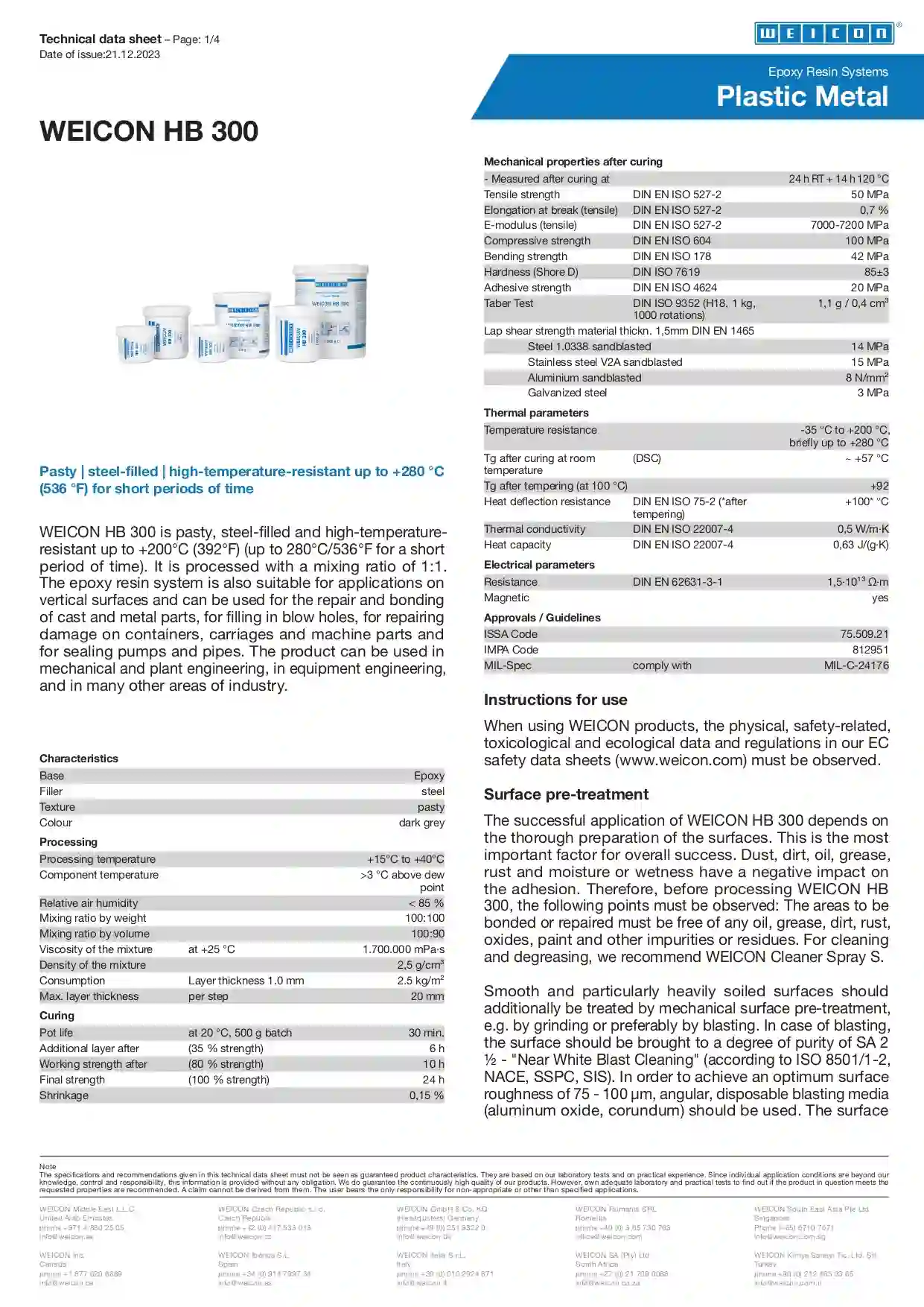 WEICON HB 300, available at SFMKART – Distributor in GUJARAT, is a pasty, steel-filled, high temperature epoxy resin system designed for reliable industrial repairs and moulding. With a mixing ratio of 1:1, this adhesive resin offers excellent bonding strength, even on vertical surfaces, ensuring easy and effective application.