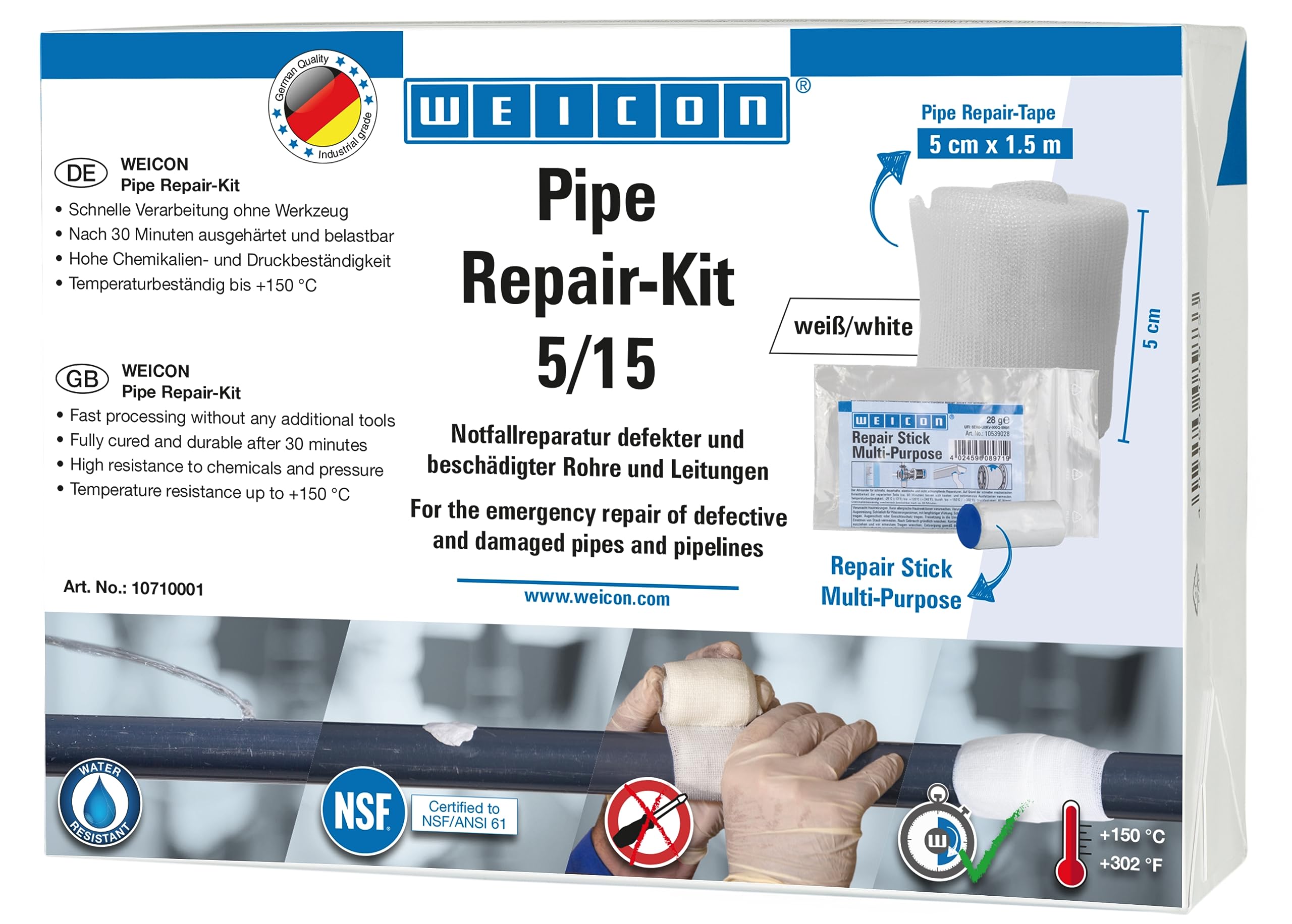The set is ideal for the emergency repair of defective and damaged pipes and pipelines. It comprises one WEICON Repair Stick Multi-Purpose, a special repair tape made of fibreglass-reinforced plastic, assembly instructions and one pair of protective gloves. The repair tape is soaked with a special resin and is activated by contact with water. The Pipe Repair-Kit can be processed without additional tools and provides reliable long-term sealing of cracks and leaks. It is very easy and fast to apply and shows excellent adhesive properties, high resistance to pressure and chemicals as well as high temperature resistance up to 150 °C. Within 30 minutes, the tape is fully cured and hard-wearing. Due to the fabric properties of the tape, the resulting high flexibility, and the easy appliaction, the Repair-Kit is especially suitabel for use on pipe bends, T-pieces, or areas difficult to reach. It can be used on many different surfaces, such as stainless steel, aluminium, copper, PVC, many plastics, fibreglass, concrete, ceramic and rubber.