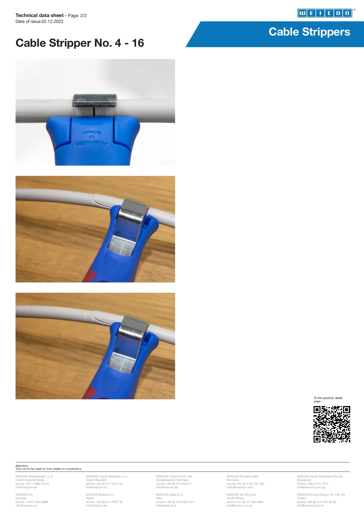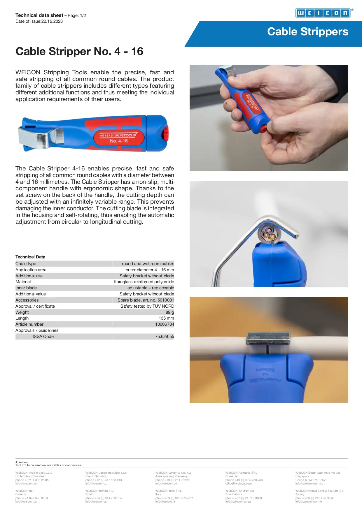 The WEICON Cable Stripper No. 4‑16 is a professional cable stripper designed to safely and efficiently remove insulation from round cables measuring 4–16 mm. Its ergonomic, fiberglass-reinforced handle ensures comfort and control during extended use. The high-quality self-turning blade automatically switches between circular and longitudinal cuts for precise stripping. The adjustable blade depth allows safe handling without damaging the inner conductor. Ideal for industrial, commercial, and residential projects, this cable stripper is available from a trusted distributor in Mumbai, providing reliable performance and long-lasting use.