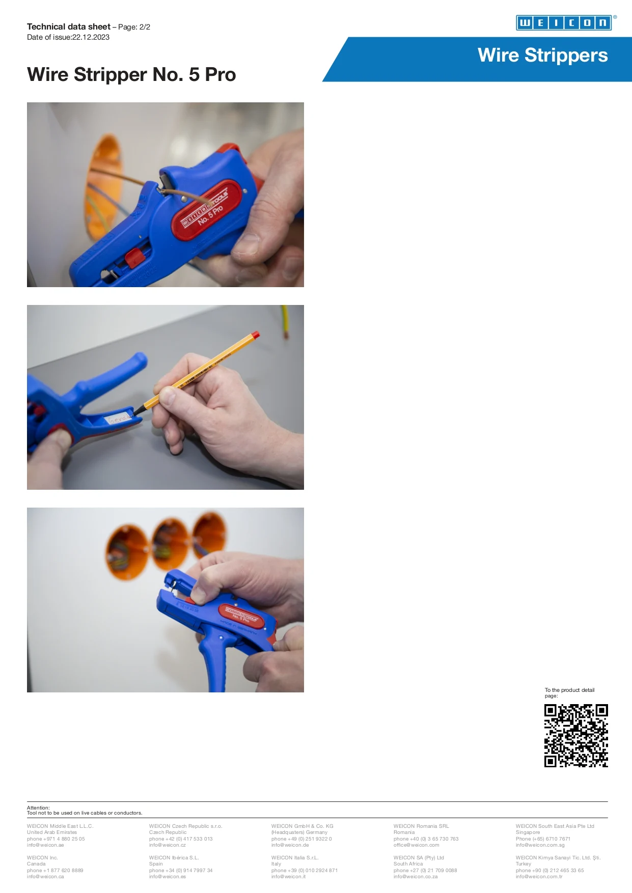The WEICON Wire Stripper No. 5 is a high-performance tool engineered for fast, safe, and precise stripping of all common stranded and solid conductors between 0.2 mm² and 6.0 mm². Built with German precision, it automatically adjusts to the cable size, ensuring clean insulation removal without damaging the inner wires.